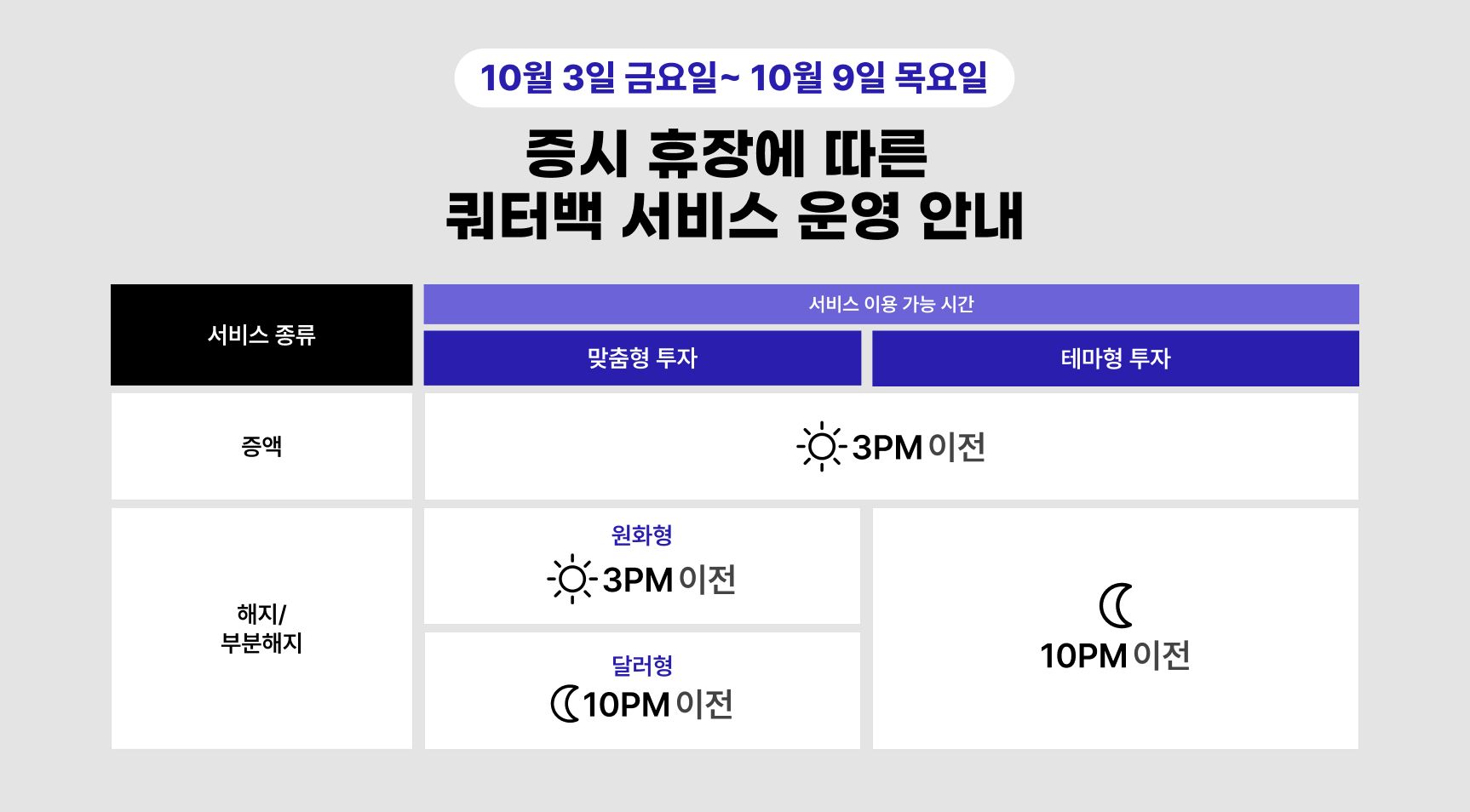 증시 휴장에 따른 서비스 운영 시간을 안내해 드리오니 이용에 참고 부탁드립니다.