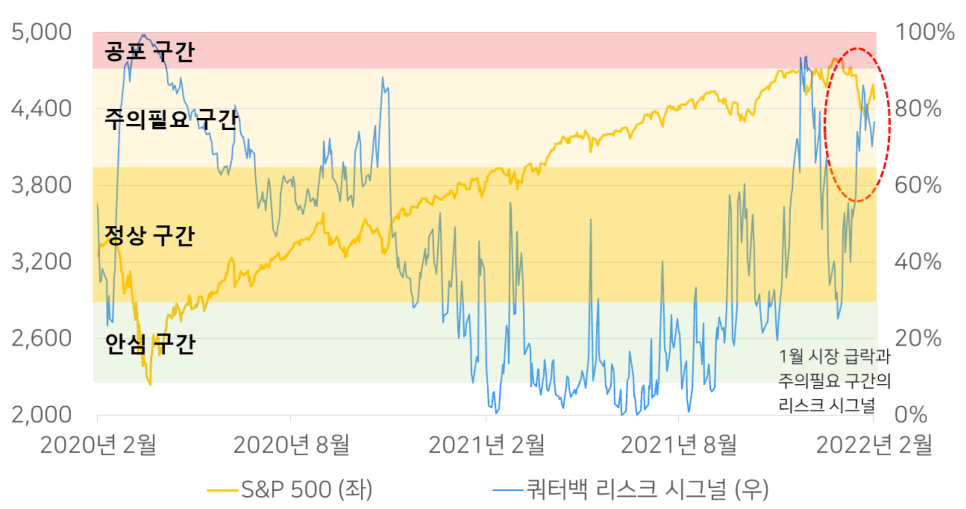 쿼터백은 시장 위험을 지표화한 리스크 시그널을 매일 공개하고 있습니다. 해당 시그널은, 1) 공포 → 2) 주의필요 → 3) 정상 → 4) 안심 → 5) 낙관의 5단계로 구분되며, 수치가 0%에 가까울수록 낙관, 100%에 근접할수록 공포 국면에 해당합니다.