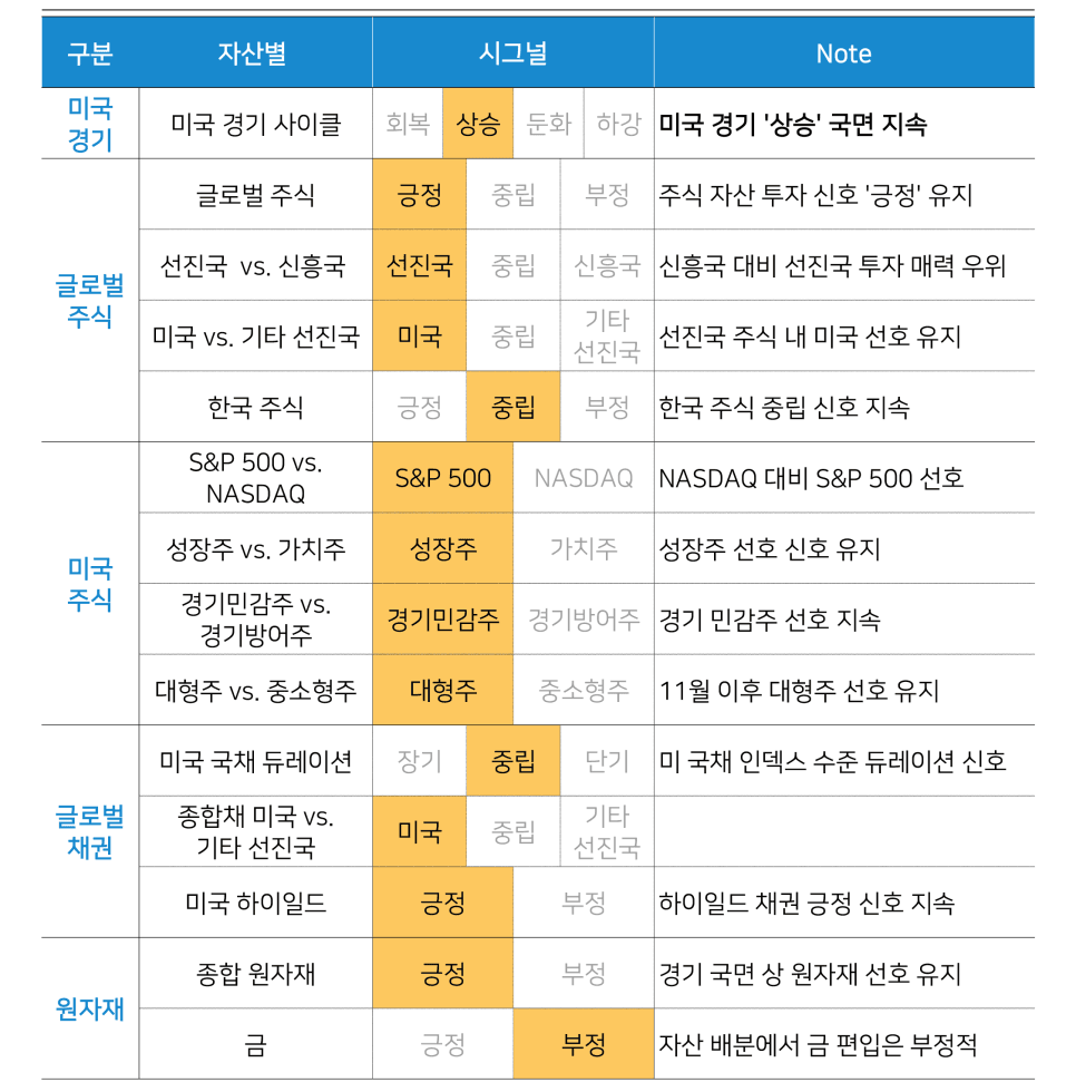원자재 및 기타 경기 상승 국면에서 원자재에 대한 ‘긍정’신호와 포트폴리오 내 편입을 유지하며, 자산 배분 전략상 금 편입에는 부정적입니다.