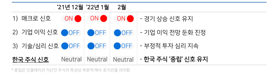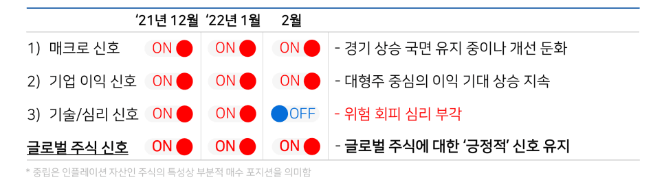 주식 2월 쿼터백은 글로벌 주식에 대한 ‘긍정적’시그널을 유지합니다. 1) 경기 국면은 여전히 상승 중이고, 2) 본격적인 실적 시즌을 맞아, 기업 이익 추정치 상향이 견고하기 때문입니다. 다만 위험 회피 강도는 2021년 대비 상승한 것으로 진단됩니다. 글로벌 주식 내 ‘선진국’ 그리고 ‘미국’ 증시 선호 신호가 유지되며, 미국 주식 내에서의 ‘대형주’, ‘경기민감주’, ‘성장주’ 선호가 1월과 동일합니다. 한국 증시에 대한 ‘중립’투자 시그널 역시 1월과 같습니다.