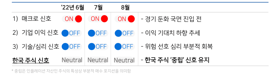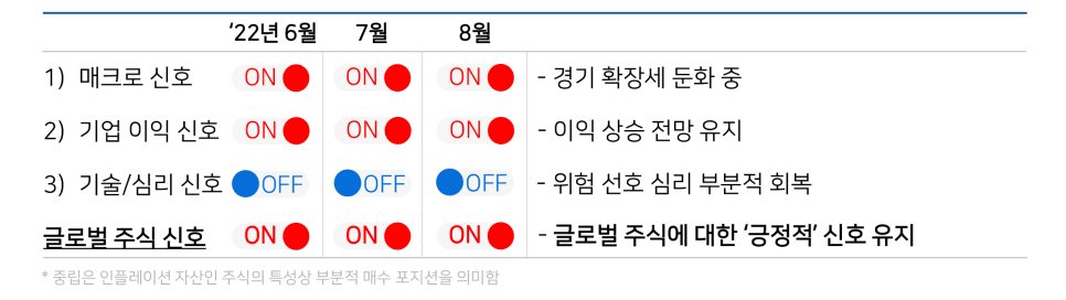 쿼터백의 알고리즘은 2022년 8월 미국 경기의 ‘둔화 국면 진입’ 진단에도 불구, 글로벌 주식에 대해서는 긍정적 신호를 유지합니다. 실적 시즌 초반에 제기된 기업 이익 부진 우려가 양호한 실적 발표로 해소 중이고, ‘급격한 경기 하강 (하드랜딩)’보다는 ‘완만한 둔화 (소프트랜딩)’ 가능성이 지표로 나타나고 있습니다.