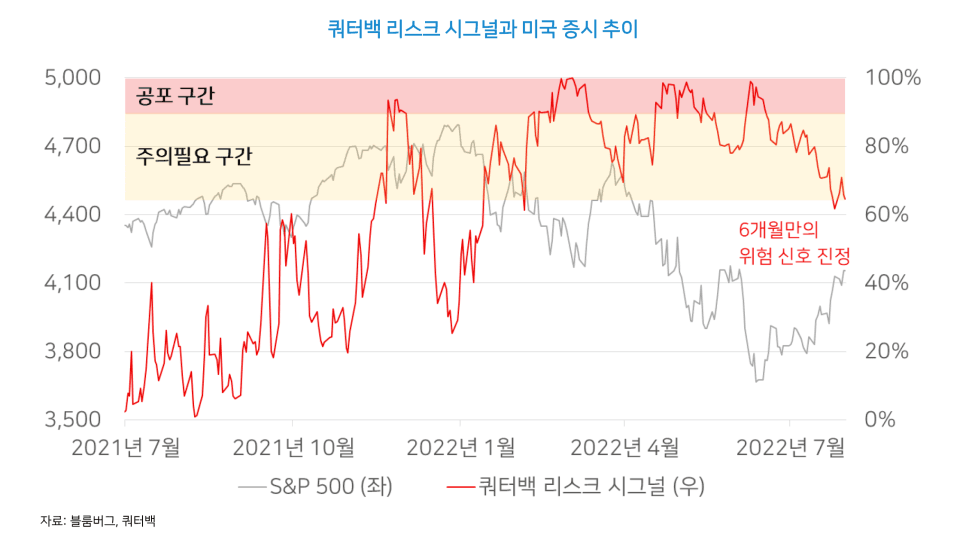 지난 2월 이후 ‘공포’ 및 ‘주의필요’ 구간에 위치하던 쿼터백의 리스크 시그널은, 6개월 만의 위험 신호 진정 추세가 나타나고 있습니다. 인플레이션과 급격한 경기 하강 우려 해소는 위험 선호 심리 회복에 기여하고 있습니다.